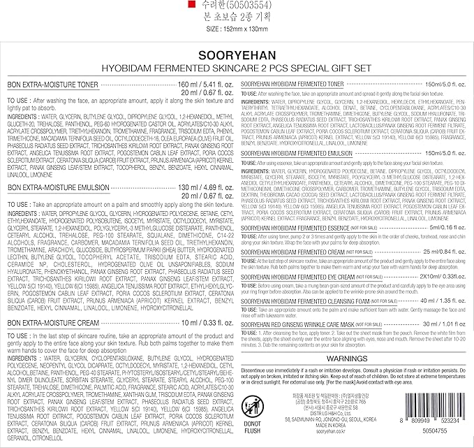 - SOORYEHAN HYOBIDAM FERMENTED SKINCARE SET – Fermented Toner (5 fl oz), Emulsion (5 fl oz), Essence (0.16 fl oz), Cream (0.84 fl oz), Eye Cream (0.33 fl oz ×2), Wrinkle Care Mask (1.01 fl oz), Cleansing Foam (1.35 fl oz)