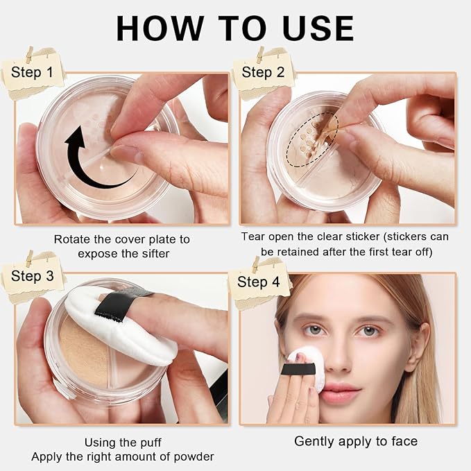 - 【Tips for Use】Dip a proper amount of loose powder with a powder puff,first press locally on the oily area,then take a small amount of powder multiple times,and pat evenly from the cheek to the forehead in a circular motion to make the makeup lasting and fit