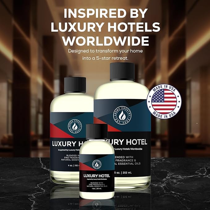 - Luxury Hotel Scent Diffuser Oil – Inspired by the iconic hotel fragrance, Luxury Hotel opens with ozone and lemon rind, blooms with gardenia, jasmine, and water lily, and finishes with amber and sheer musk for a refined, five-star aroma.